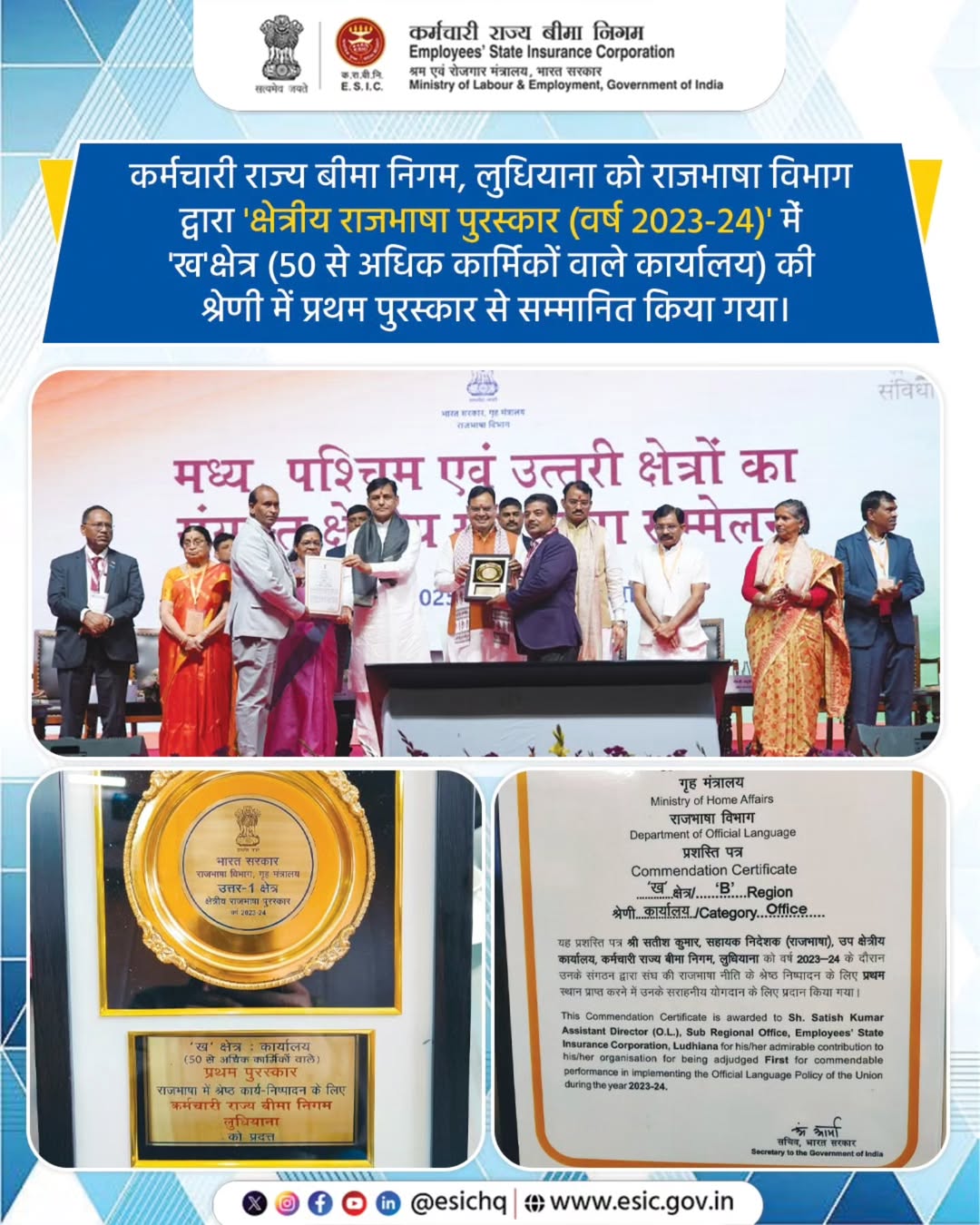 ESIC क्षेत्रीय कार्यालय हिमाचल प्रदेश को छोटे क्षेत्र श्रेणी में उत्कृष्ट प्रदर्शन हेतु runner up trophy से पुरस्कृत किया गया